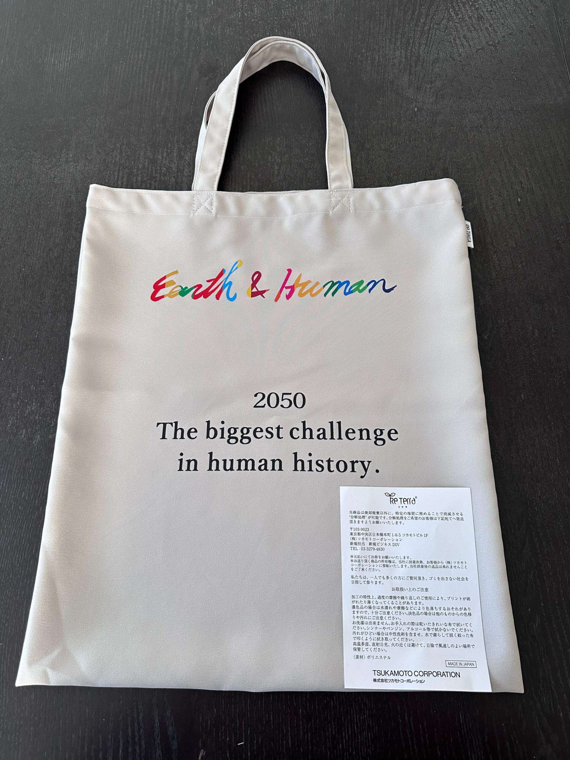 この度、Earth&Humanは、株式会社ツカモトコーポレーションが開発したとRe Terra®という生分解する新素材(ポリエステル)を使用し、環境保護への普及啓発活動として、オリジナルエコサブバッグを作製いたしました!