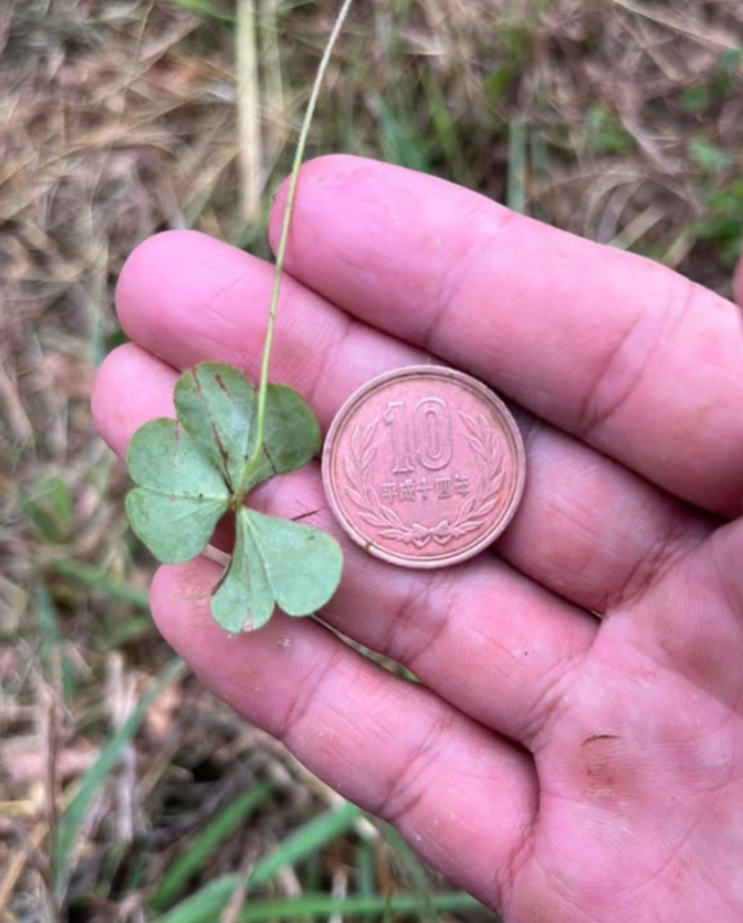 足元のカタバミの葉を見つけて、10円玉を擦るとびっくり!ピカピカに✨