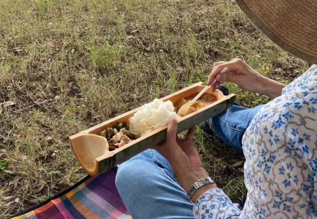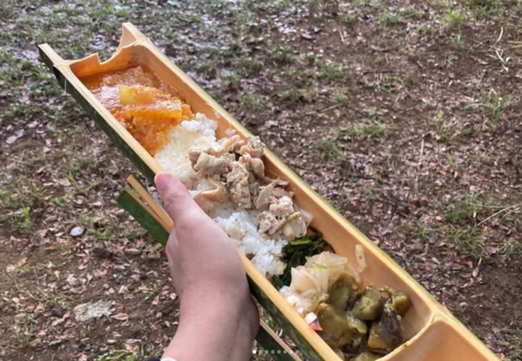 自分で作った竹のお皿、お箸を使って食べるごはんに幸せを感じます。