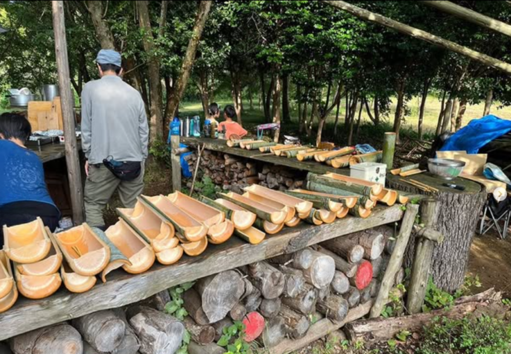 竹のカトラリー作りで作った竹のお皿とお箸をお水で洗ってごはんの時間です!