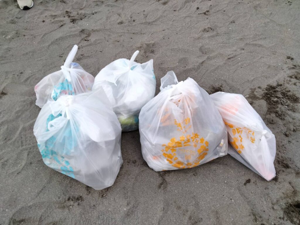 海岸ごとにゴミの種類も違っていて、今日のビーチではガラスや焼き物の破片が多くみられました。海岸と陸地の境目にペットボトルやお菓子の袋のほか、タバコの吸い殻も多かったです。