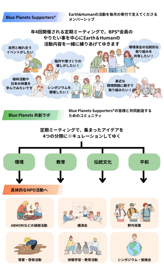 そこで、Earth&Humanでは【Blue Planets Supporters®︎ 共創ラボ(BPS共創ラボ)】というコミュニティで、これから「環境・教育・伝統文化・平和」の4本の柱をもとに、Blue Planets Supporters®の皆様がやりたいことを事業にしていく方針です。